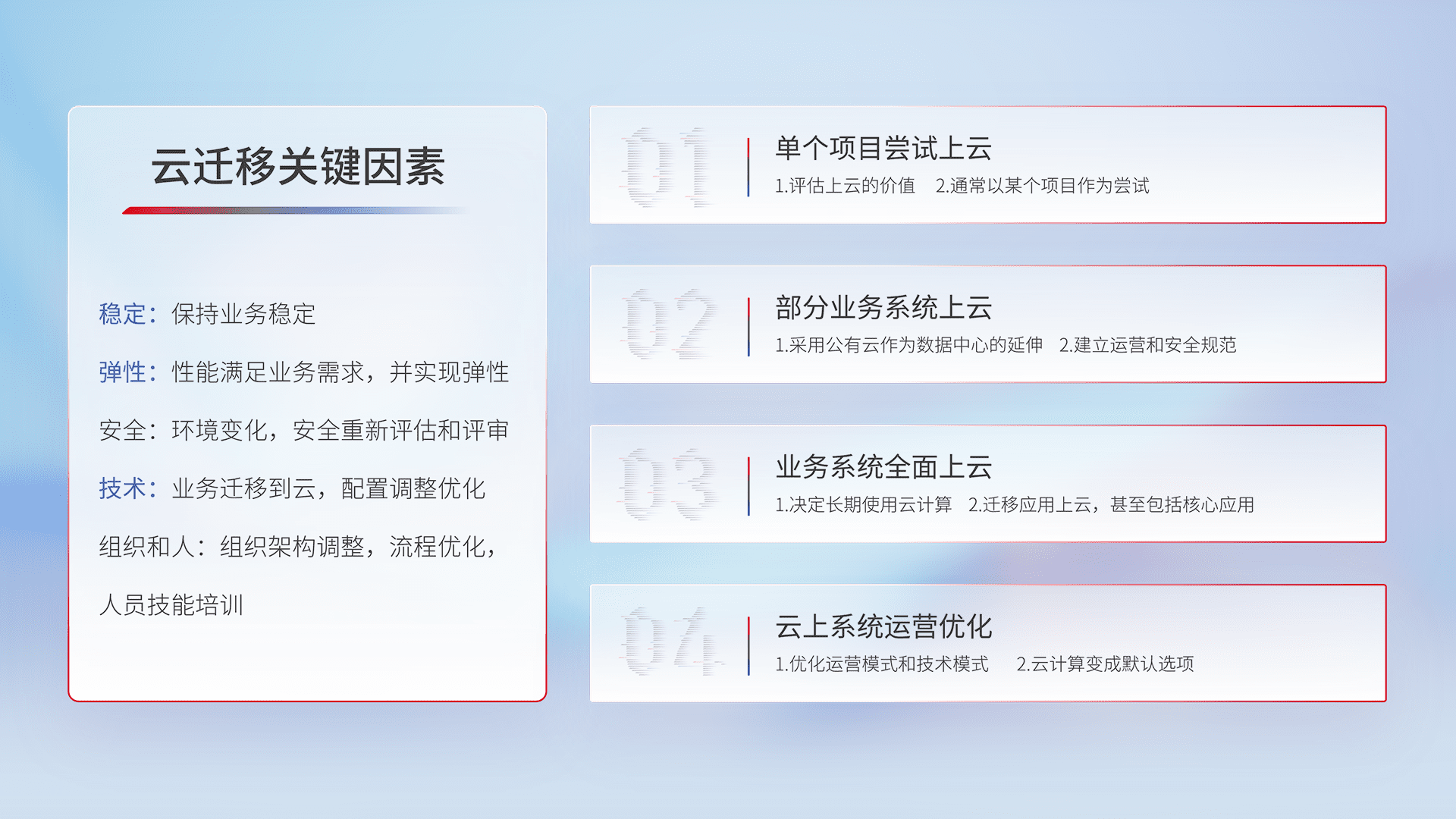 结合实际业务,,,从规划设计、、、云平台选型、、、、云原生改造、、数据迁移、、集成交付,,,,迁移全过程为客户识别最佳上云路径,,,,做好风险识别管理,,,设计网络架构、、、、身份权限、、、安全审计合规、、、操作审计、、、、日志审计、、、监控告警策略、、、、多站点容灾设计等,,,,对云上基础设施进行整体规划,,,,提升IT治理水平,,,,以满足弹性、、、、高可用、、、、高性能的需求。。。。