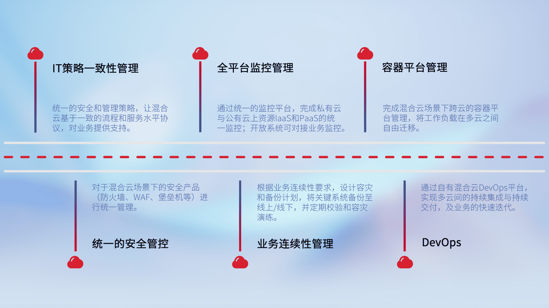 通过多云纳管,,以统一的资源数据模型把客户的云资源进行抽象和封装,,,,进而实现对多云资源的统一操作,,,保障云资源管理的可靠性、、、、稳定性与可用性。。。。量身定制化运维内容,,,配置、、、、开发运维、、、补丁管理、、、备份、、、、监控、、认证和访问管理、、审计和日常巡检等,,保障在用云过程中的可靠度,,稳定度以及高可用率。。。。