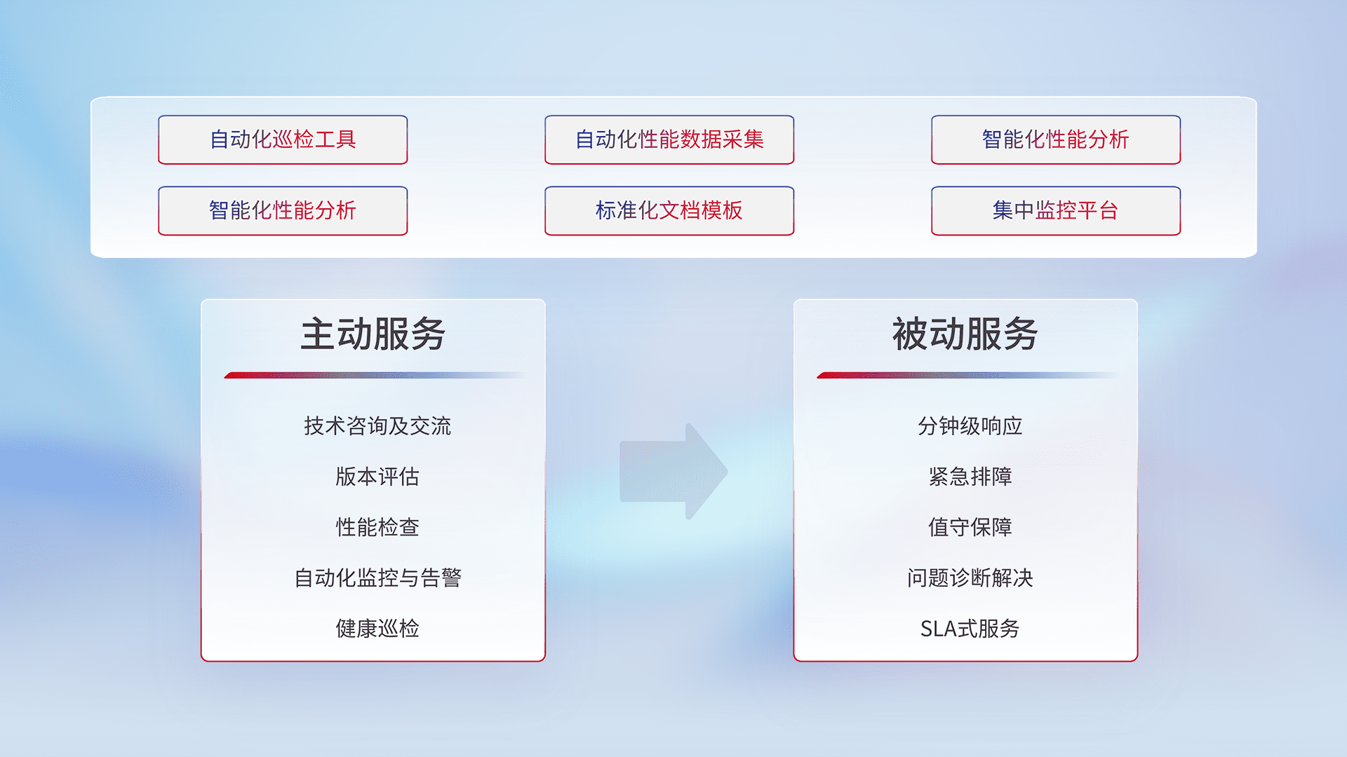 智能化工具和标准化文档,,,保障服务质量,,提供主动服务(包含技术咨询、、、、版本评估、、性能检查、、、自动化监控与告警、、、、健康巡检)和被动服务包含(分钟级响应、、、、紧急排障、、、、值守保障、、问题诊断解决、、SLA服务)。。。。
